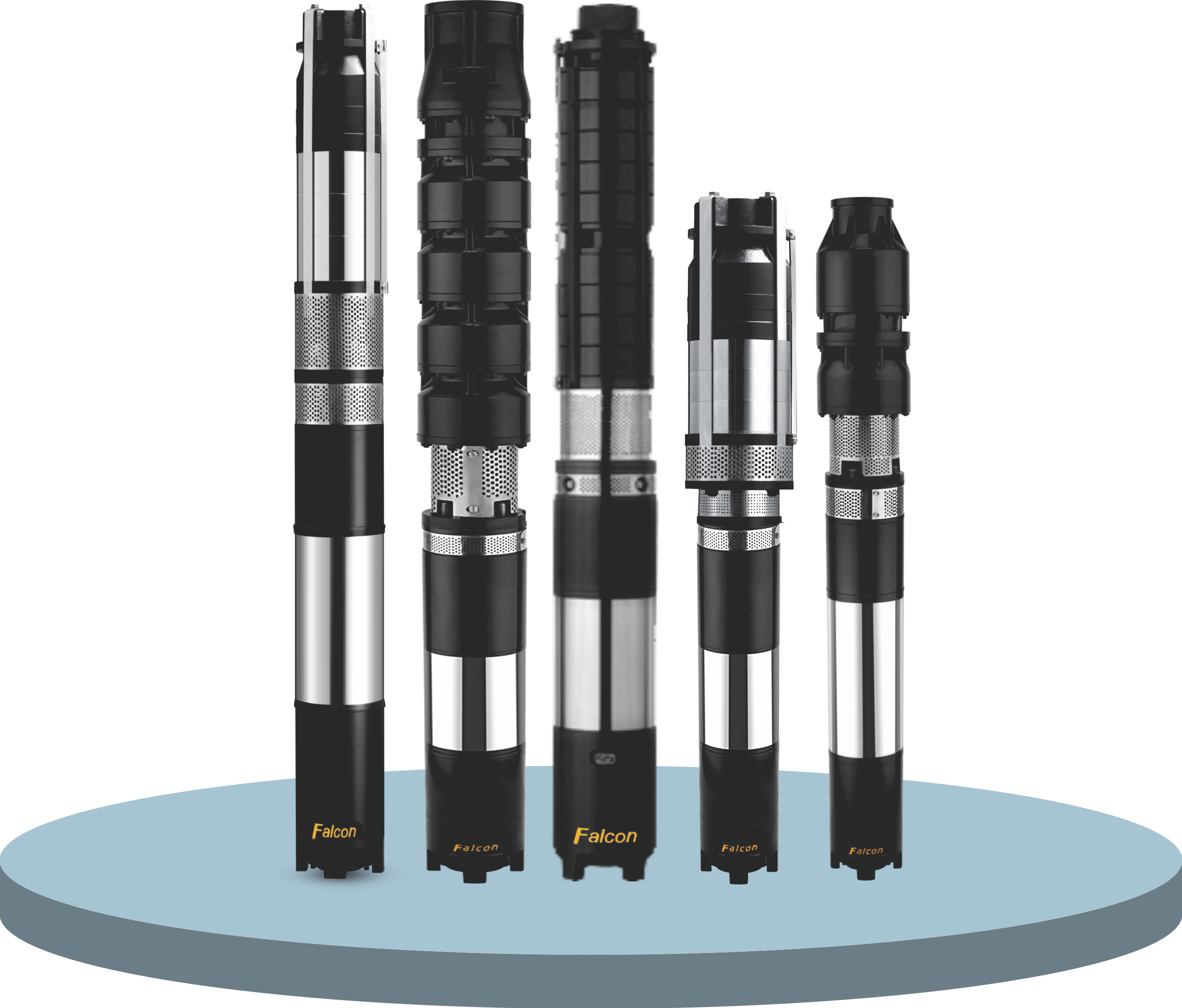 THE IMAGE DISPLAYS A RANGE OF FALCON SUBMERSIBLE PUMPS , WHICH ARE VERSATILE, HIGH - PERFORMANCE PUMPING SOLUTIONS DESIGNED FOR EFFICIENT WATER EXTRACTION FROM DEEP SOURCES.