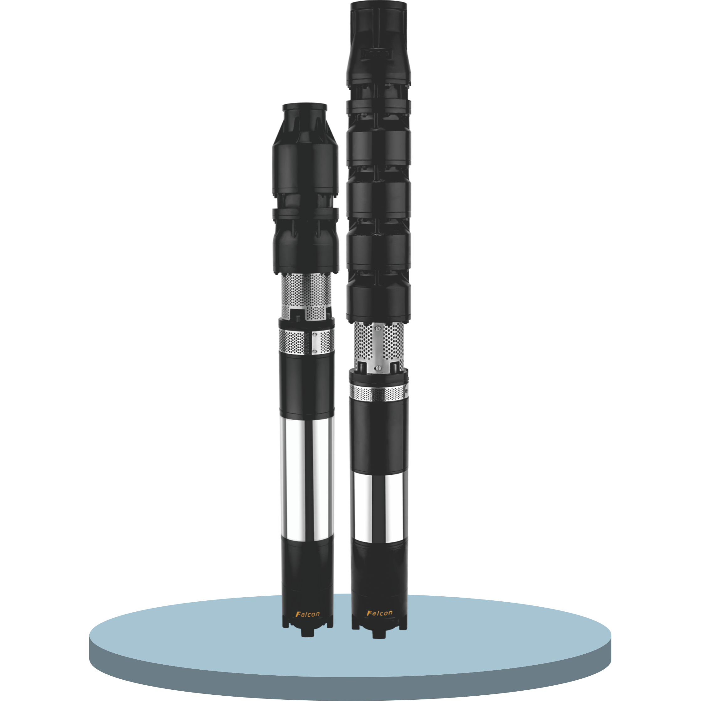 THE IMAGE DISPLAYS FALCON 7-INCH SUBMERSIBLE PUMP SETS, WHICH ARE ENGINEERED FOR DEEP WATER EXTRACTION.